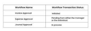 There is a unified dashboard called the Workflow Transaction Console that is utilized to oversee and address workflow tasks for various transactions such as Invoice, Expenses, and Journal Approval processes. This console serves as a proactive tool for tracking and resolving any workflow-related errors. Several financial workflows are provided as illustrative examples.